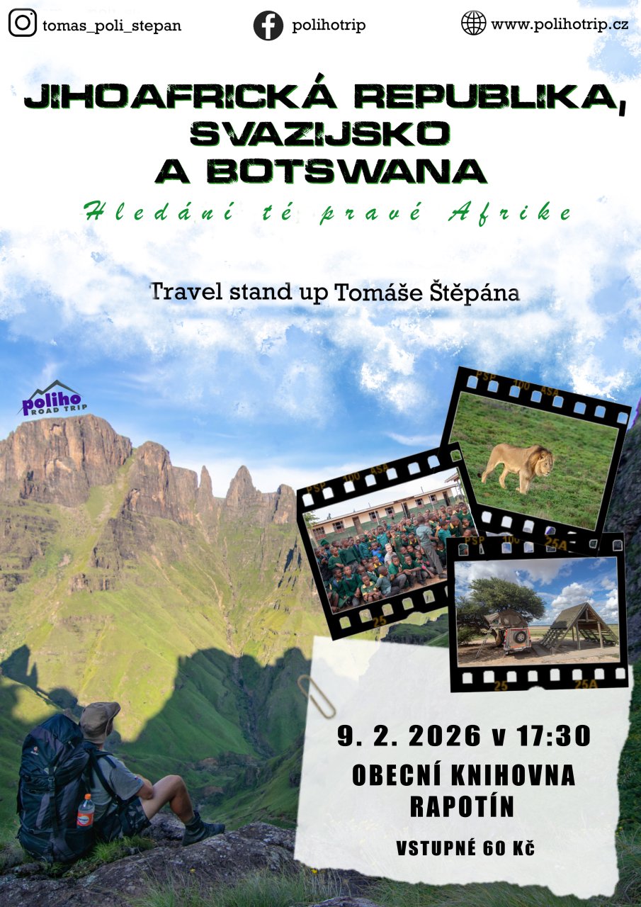 Cestovatelskou besedu Tomáše Štěpána pořádá v pondělí 9. února od 17.30 hodin Kulturní dům Rapotín. Pořad má název Jihoafrická republika, Svazijsko a Botswana – hledání té pravé Afriky a návštěvníci se mohou těšit na projekci fotek, autentické zážiky i zajímavosti o Africe. Vstupné činí symbolických 60 korun.