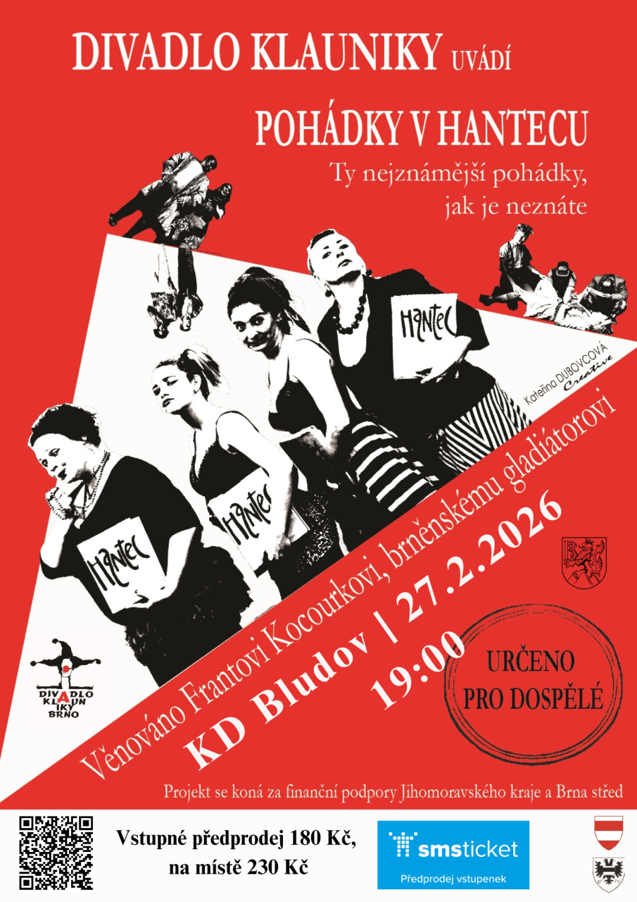 Kulturní dům v Bludově zve na lechtivou komedii pro dospělé. "Ty nejznámější pohádky, jak je neznáte," tak zní podtitul představení Pohádky v hantecu, které v pátek 27. února uvede v Bludově Divadlo Klauniky. Začátek je v 19 hodin, vstupné činí v předprodeji 180 korun.
