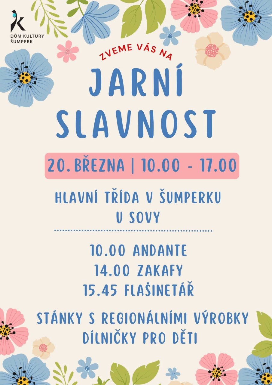 V pátek 20. března se v Šumperku v parku u sovy uskuteční Jarní slavnost. Vystoupí folklorní soubor Andante, Zakafy, flašinetář a také zde návštěvníci najdou stánky s regionálními výrobky a dílničky pro děti.