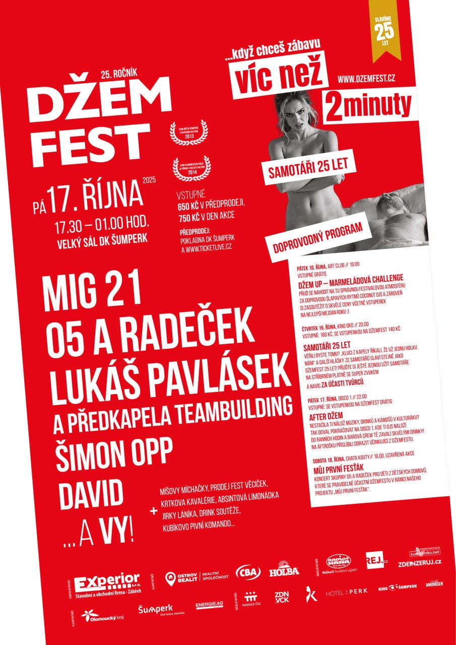 Hlavní program pak vypukne v pátek 17. října ve velkém sále Domu kultury Šumperk. V bohatém programu 25. ročníku šumperského festivalu vystoupí kromě MIG 21 a O5 a Radeček vycházející hvězda Šimon Opp, který je nejen zpěvák, ale také úspěšným hercem známým z televizních obrazovek. „Na Džemfestu dostanou šanci i další talentovaní mladí umělci, kteří uspěli v naší vyhledávací soutěži Radiotalent,“ doplnil Ondřej Polák.