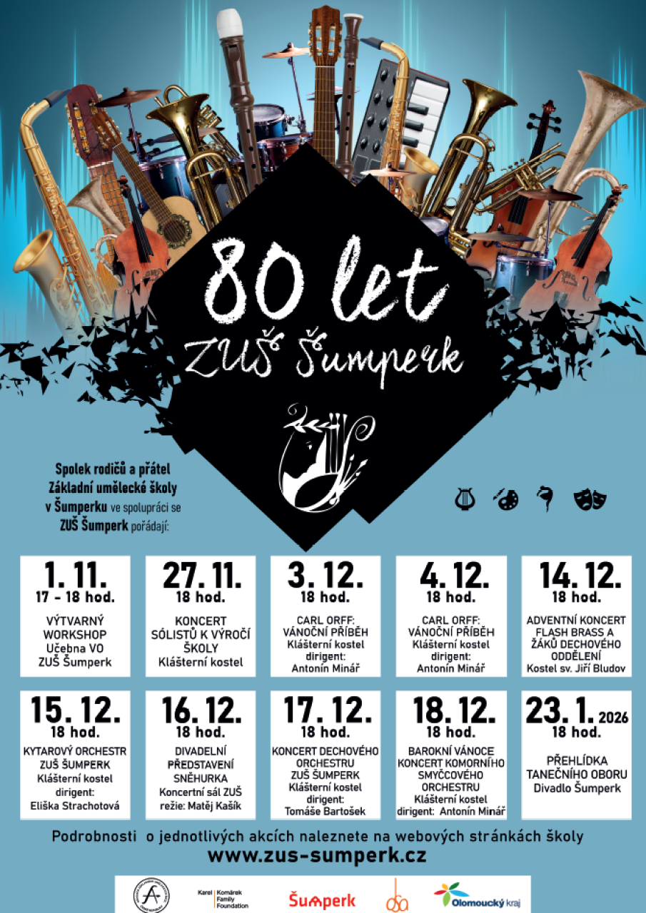 Hudební část oslav uzavřou dvě akce. 17. prosince se představí Dechový orchestr ZUŠ Šumperk pod taktovkou Tomáše Bartoška a o den později Komorní smyčcový orchestr s programem Barokní Vánoce, který připravil pan učitel Antonín Minář.