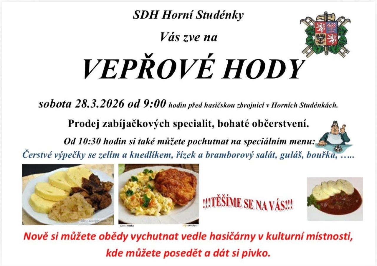 "Zabíjačkové hody jsou ideální příležitostí, jak strávit sobotu v přátelské atmosféře, ochutnat poctivé domácí speciality a užít si začátek jara s rodinou i přáteli," zve David Rýznar za pořadatele ze Sboru dobrovolných hasičů Horní Studénky.