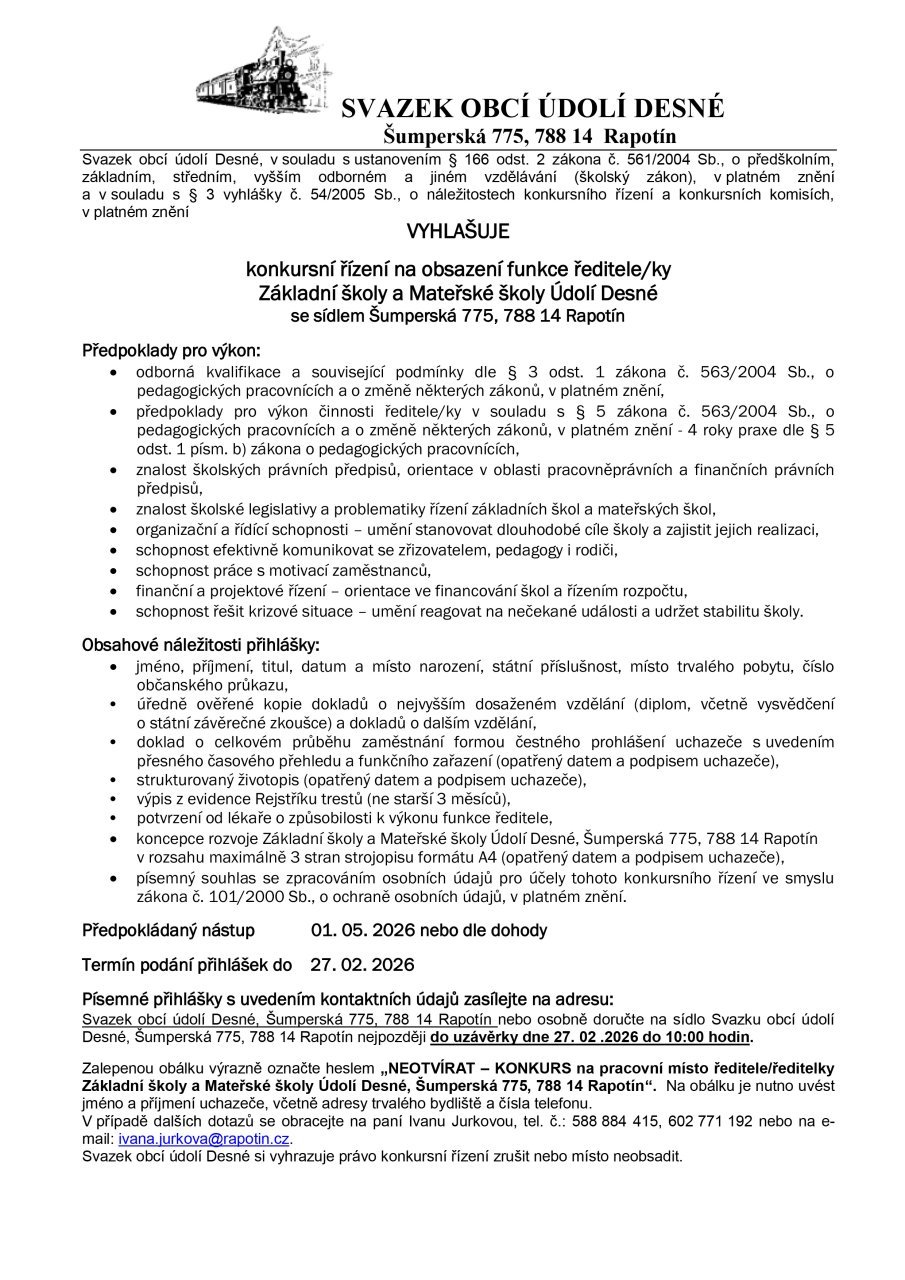 Novou ředitelku nebo nového ředitele hledá svazková škola Základní škola a Mateřská škola Údolí Desné se sídlem v Rapotíně zřízená Svazkem obcí údolí Desné. Základní školy a mateřské školy mají pracovišttě v Rapotíně, Petrově nad Desnou a Sobotíně. Termín přihlášek je do 27. února a nový šéf by měl nastoupit ideálně začátkem května, příp. dle dohody. Veškeré další podrobné informace najdete v přiloženém letáku.