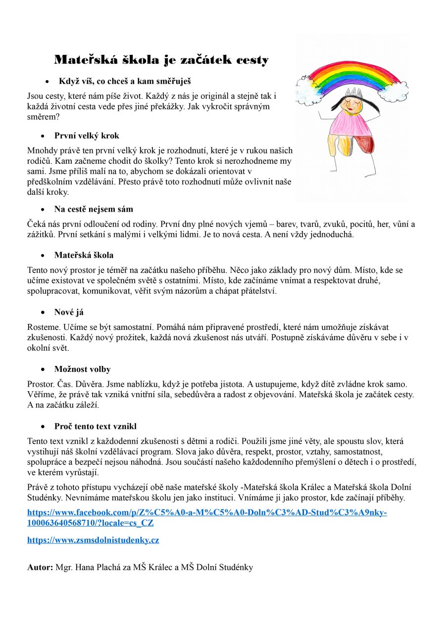 Chcete se o nás dozvědět více nebo nás navštívit? Rádi vás i vaše děti u nás přivítáme. Přijďte se přesvědčit, že školka může být místem, kde začínají ty nejkrásnější vzpomínky na dětství.